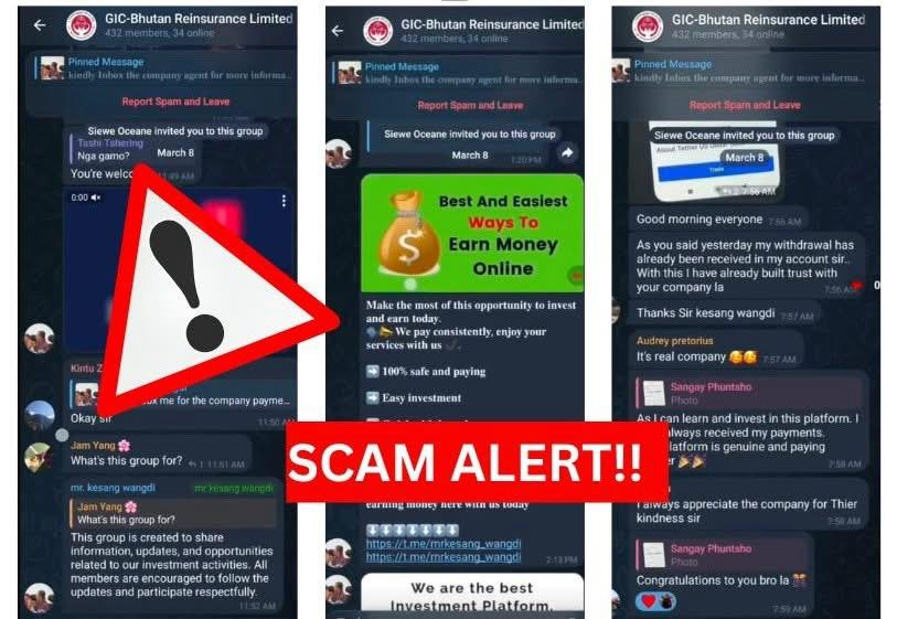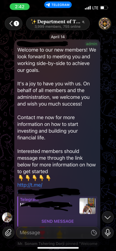 The Bhutan Computer Incident Response Team (BtCIRT), Cybersecurity Division, GovTech Agency, earnestly urges the general public to remain vigilant and avoid falling victim to Telegram channels soliciting investment opportunities.